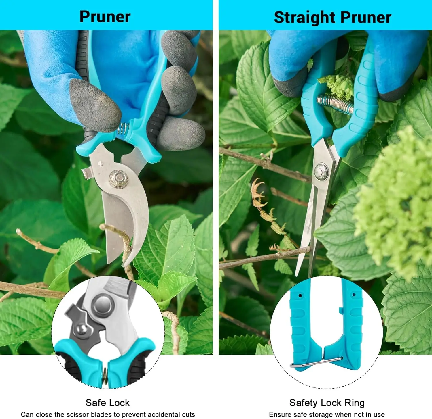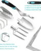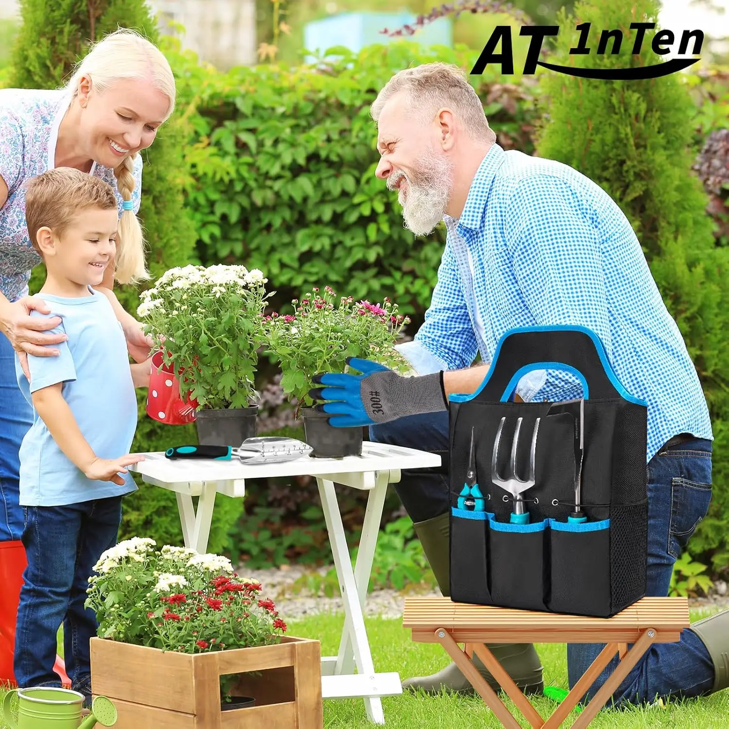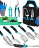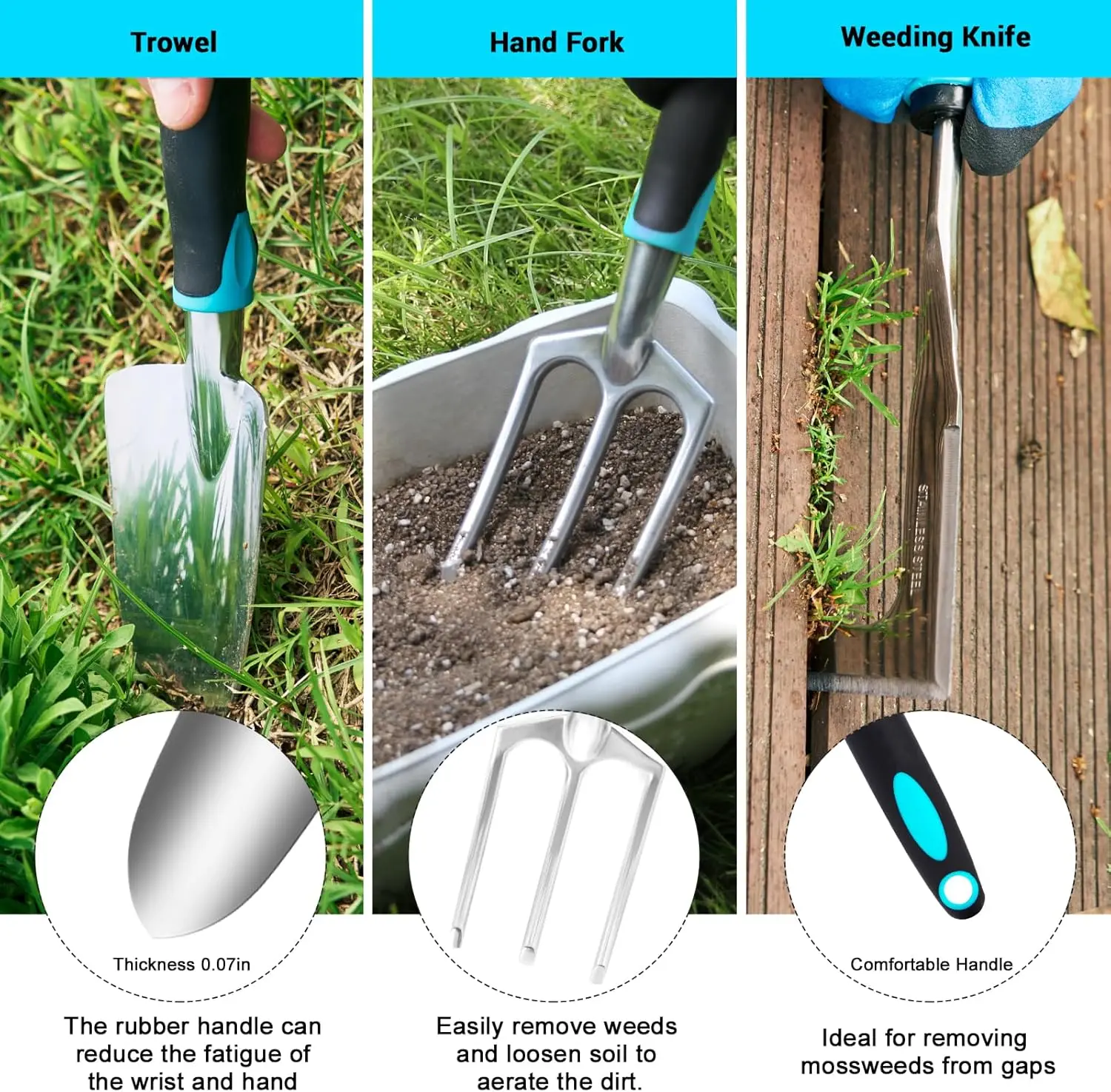 Enhance your gardening experience with our premium 11-piece stainless steel garden tool set, designed for durability and comfort. Key features include: 1. High-Quality Materials: Made from rust-resistant stainless steel, these tools are built to last through seasons of use in various outdoor conditions. 2. Ergonomic Design: Each tool features a non-slip rubber grip that provides a secure hold, reducing hand fatigue during extended gardening sessions. 3. Comprehensive Kit: This set includes essential tools such as a trowel, cultivator, transplanter, weeder, pruner, and more—all stored conveniently in a durable tote bag for easy transport and organization. 4. Added Accessories: Comes with a repotting mat to keep your workspace clean and an uprooting weeding tool for efficient weed removal without bending over. 5. Versatile Use: Ideal for a wide range of gardening tasks like planting, weeding, pruning, and soil preparation in gardens, flower beds, or pots. 6. Perfect Gift Option: A thoughtful present for gardeners of all skill levels—suitable for women and men who enjoy spending time outdoors cultivating plants. 7. Easy Maintenance: Tools are easy to clean after use; simply wipe down with a damp cloth to maintain their appearance and functionality over time. Invest in this reliable garden tool set to simplify your gardening projects while enjoying the benefits of sturdy construction and user-friendly features.