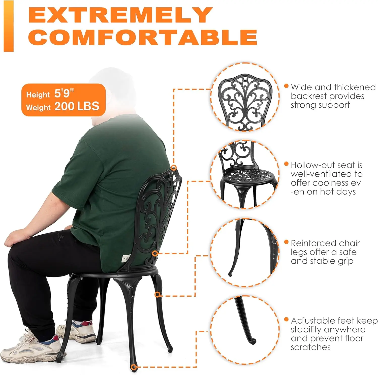 5. EASY ASSEMBLE: Easily assembled with hardware packs of this 3 pieces cast aluminum patio bistro sets, adjustable feet keep outdoor patio set stability anytime and anywhere and prevent unwanted sliding and floor scratches
