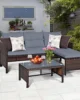 Size of Sofa Set: The set includes a loveseat sofa, a lounge sofa, a coffee table with tempered glass top, three back cushions, and two seat cushions. Weight capacity of the sofa set: 705 lbs; weight capacity of the coffee table: 110 lbs; loveseat sofa dimensions: 47.5” x 24” x 25” (L x W x H); lounge sofa dimensions: 47” x 24” x 25” (L x W x H); coffee table dimensions: 31.5” x 18” x 14.5” (L x W x H).
