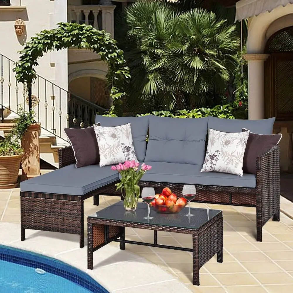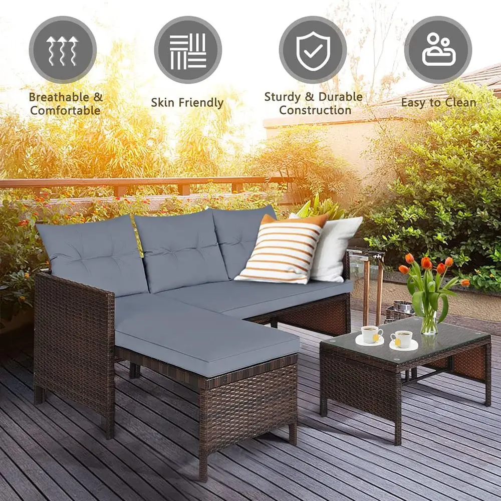 3-Piece Outdoor Patio Sectional Sofa Set with Cushions, Wicker Rattan, Steel Frame, Suitable for Garden, Lawn, Pool, and Backyar